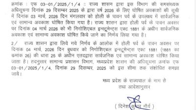 मध्यप्रदेश शासन ने की होली के दो दिवसीय अवकाश की...