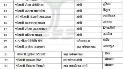 MP - महिला मोर्चे में प्रदेश पदाधिकारियो के नामों की...