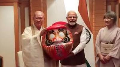 टोक्यो में शोरिनजान दारुमा-जी मंदिर के मुख्य पुजारी रेव सेशी हिरोसे ने प्रधानमंत्री नरेंद्र मोदी को दारुमा गुड़िया भेंट की, जो सौभाग्य का प्रतीक एक पारंपरिक जापानी गुड़िया है। प्रधानमंत्री नरेन्द्र...