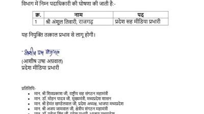 भोपाल l भारतीय जनता पार्टी के प्रदेश अध्यक्ष श्री हेमंत खण्डेलवाल की सहमति से मीडिया विभाग में भाजपा के नए सह मीडिया प्रभारी अंशुल तिवारी के नाम की घोषणा की गई है...