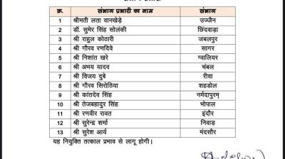 भोपाल l भारतीय जनता पार्टी के प्रदेश अध्यक्ष व विधायक श्री हेमंत खंडेलवाल ने आज संभाग प्रभारियो कि नियुक्ति की है जो इस प्रकार है l