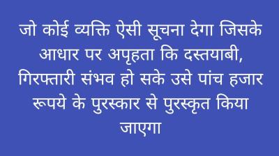 कोई व्यक्ति ऐसी सूचना देगा जिसके आधार पर अपृहता कि दस्तयाबी, गिरफ्तारी संभव हो सके उसे मिलेंगे पांच हजार रूपये