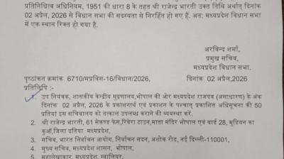 दतिया से विधायक राजेंद्र भारती के मामले में न्यायालय द्वारा तीन वर्ष की सजा सुनाए जाने के बाद उनकी विधानसभा सदस्यता समाप्त कर दी गई है। विधानसभा अध्यक्ष नरेंद्र सिंह...