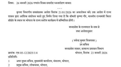 भोपाल / 16वें राष्ट्रीय मतदाता दिवस के अवसर पर दिनांक 23 जनवरी 2026 को नवीन पुलिस मुख्यालय परिसर, भोपाल में शपथ ग्रहण कार्यक्रम का आयोजन किया जाएगा। शासन के निर्देशानुसार...