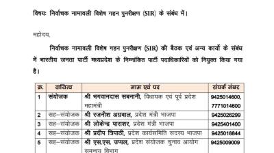 भोपाल l भारतीय जनता पार्टी के प्रदेश अध्यक्ष व विधायक श्री हेमंत खण्डेलवाल द्वारा निर्वाचक नामावली विशेष गहन पुनरीक्षण (एसआईआर) के संबंध में संयोजक एवं सह-संयोजकों की नियुक्ति की जाती...