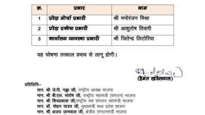 भोपाल l भारतीय जनता पार्टी के प्रदेश अध्यक्ष व विधायक श्री हेमंत खण्डेलवाल के द्वारा निम्नलिखित प्रभारियों की घोषणा की जाती है l