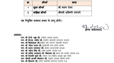 भोपाल l भारतीय जनता पार्टी के प्रदेश अध्यक्ष व विधायक श्री हेमंत खण्डेलवाल के द्वारा निम्नलिखित मोर्चा के प्रदेश अध्यक्षों की घोषणा की जाती है l
