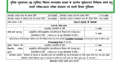 भोपाल l पुलिस मुख्यालय के अंतर्गत सूबेदार/उप निरीक्षक संवर्ग के 500 पदो की सीधी भरती के लिये चयन परीक्षा-2025 का विज्ञापन मध्यप्रदेश कर्मचारी चयन मंडल द्वारा 7 अक्टूबर 2025 को...