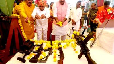 दशहरे के अवसर पर शस्त्र पूजन कार्यक्रम में राजस्व मंत्री श्री वर्मा ने किया शस्त्र एवं वाहनों का पूजन