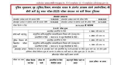 भोपाल l मध्य प्रदेश पुलिस में भर्ती की तैयारी कर रहे युवाओं के लिए मध्यप्रदेश कर्मचारी चयन मंडल ने राज्य में पुलिस भर्ती परीक्षा 2025 की आधिकारिक घोषणा कर दी है। जारी...