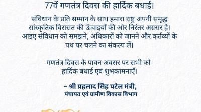 पंचायत मंत्री प्रहलाद सिंह पटेल ने दी राष्ट्रीय पर्व गणतंत्र दिवस की शुभकामनाएं