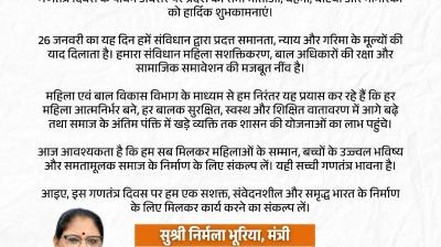 महिला एवं बाल विकास मंत्री सुश्री निर्मला भूरिया ने दी 77वें गणतंत्र दिवस की हार्दिक शुभकामनायें