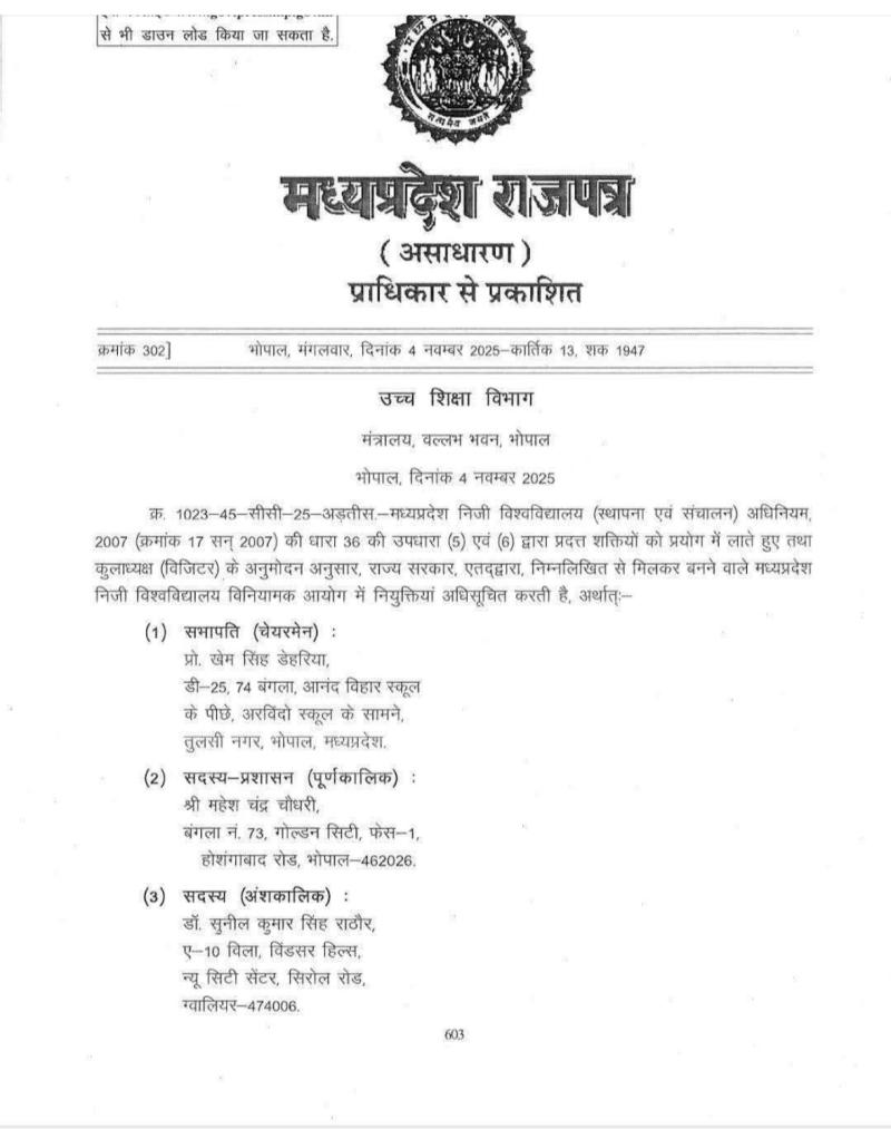 भोपाल। मध्य प्रदेश सरकार ने मध्यप्रदेश निजी विश्वविद्यालय विनियामक आयोग के अध्यक्ष पद पर खेम सिंह डेहरिया की नियुक्ति की है। वहीं दो सदस्य भी बनाए गए हैं l