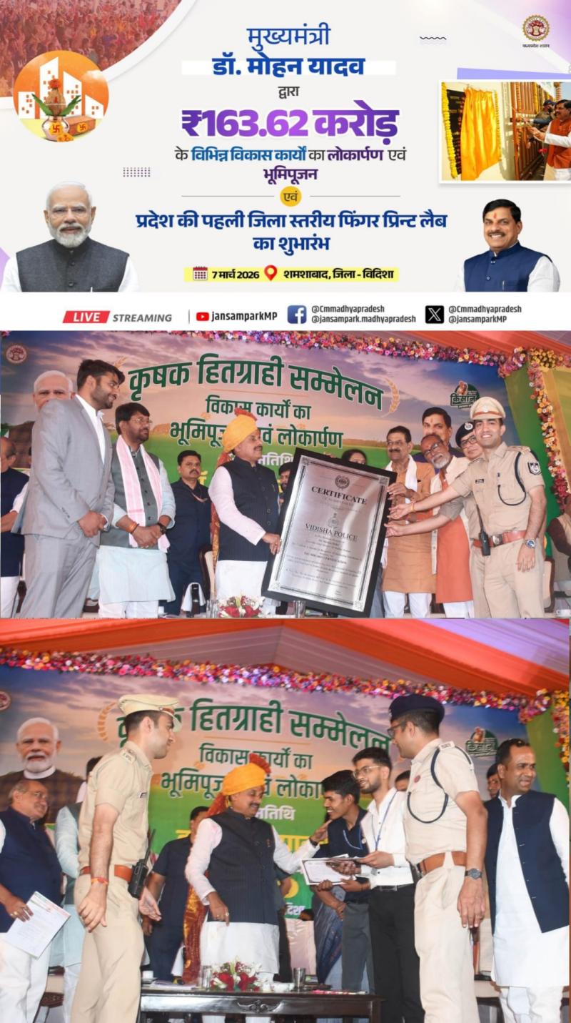 इस अवसर पर माननीय मुख्यमंत्री द्वारा पुलिस महानिरीक्षक, भोपाल (देहात) जोन श्री संजय तिवारी तथा पुलिस अधीक्षक विदिशा श्री रोहित काशवानी को पुलिस कार्यालय एवं जिले के विभिन्न थानों के लिए प्राप्त ISO प्रमाण-पत्र प्रदान किए गए। विदिशा जिले के 20 थानों तथा 5 पुलिस कार्यालयों का अंतरराष्ट्रीय मानकों के अनुरूप उन्नयन किया गया है। पुलिस थानों और कार्यालयों में ISO मानकों को लागू करने का उद्देश्य सेवा की गुणवत्ता, पारदर्शिता और नागरिक संतुष्टि को बढ़ाना है, जिससे आमजन को अधिक व्यवस्थित और बेहतर पुलिस सेवाएं उपलब्ध हो सकें।