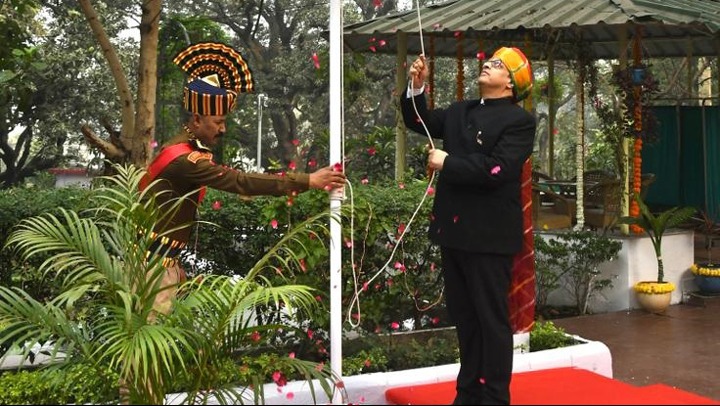 भोपाल - 77वें गणतंत्र दिवस पर मुख्यमंत्री निवास में मुख्यमंत्री के अपर मुख्य सचिव श्री नीरज मंडलोई ने राष्ट्र ध्वज फहराया। इस अवसर पर सामूहिक राष्ट्रगान हुआ। मध्यप्रदेश हिंदी ग्रंथ अकादमी के संचालक श्री अशोक कडेल विशेष रूप से उपस्थित थे। अपर मुख्य सचिव श्री मंडलोई ने मुख्यमंत्री सचिवालय तथा निवास कार्यालय के सभी अधिकारी-कर्मचारियों और सुरक्षा स्टाफ को गणतंत्र दिवस की हार्दिक बधाई और शुभकामनाएं दी। अपर मुख्य सचिव श्री मंडलोई ने इसके पहले विंध्य कोठी में भी ध्वज फहराया।