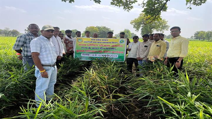 खरगोन । उद्यानिकी विभाग के कृषकों के लिए तीन दिवसीय राज्य के अंदर प्रशिक्षण सह भ्रमण कार्यक्रम के द्वितीय दिवस 09 अक्टूबर को खंडवा जिले के विकासखंड पंधाना स्थित ग्राम बोरगांव बुजुर्ग में कृषक श्री महेश चौधरी के प्रक्षेत्र का भ्रमण किया गया। इस अवसर पर कृषकों के दल ने अदरक फसल की उन्नत कृषि तकनीक एवं कार्यमाला की जानकारी प्राप्त की। भ्रमण के दौरान कृषकों ने फसल प्रबंधन, रोग नियंत्रण एवं उत्पादकता वृद्धि से संबंधित जानकारी भी प्राप्त की।
