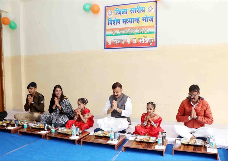 नरसिंहपुर l गणतंत्र दिवस समारोह के मुख्य अतिथि प्रदेश के परिवहन एवं स्कूल शिक्षा मंत्री श्री उदय प्रताप सिंह विद्यार्थियों के साथ भोजन किया। मंत्री श्री सिंह शासकीय नेहरू उच्चतर माध्यमिक विद्यालय नरसिंहपुर में आयोजित मध्यान्ह भोजन के जिला स्तरीय विशेष भोज के कार्यक्रम में शामिल हुये। यहां जिला पंचायत अध्यक्ष श्रीमती ज्योति नीलेश काकोड़िया, नगर पालिका अध्यक्ष श्री नीरज दुबे, अन्य जनप्रतिनिधि, कलेक्टर श्रीमती रजनी सिंह, पुलिस अधीक्षक श्री ऋषिकेश मीणा, सीईओ जिला पंचायत श्री गजेन्द्र सिंह नागेश और अन्य अधिकारियों ने भी विद्यार्थियों के साथ भोजन किया। विशेष भोज में सब्जी- पूरी- खीर, पापड़, सलाद, लड्डू आदि परोसा गया।