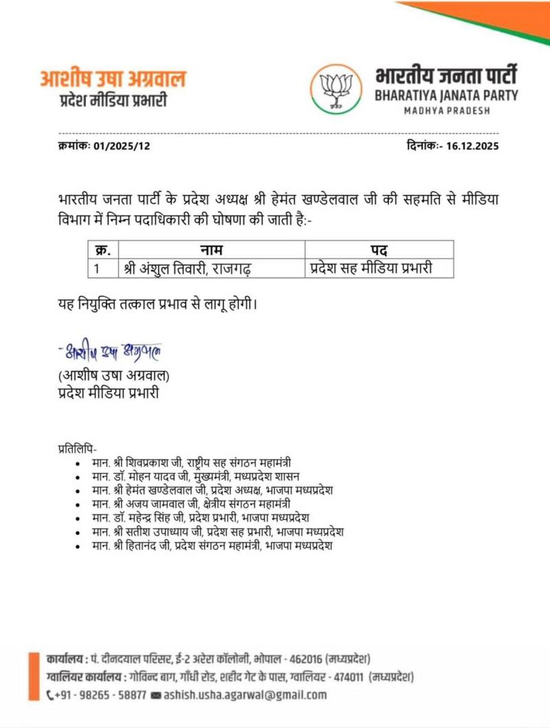 भोपाल l भारतीय जनता पार्टी के प्रदेश अध्यक्ष श्री हेमंत खण्डेलवाल की सहमति से मीडिया विभाग में भाजपा के नए सह मीडिया प्रभारी अंशुल तिवारी के नाम की घोषणा की गई है l