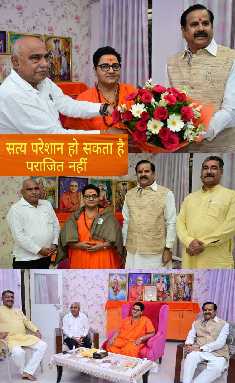 भोपाल । भारतीय जनता पार्टी के प्रदेश अध्यक्ष व विधायक श्री हेमंत खण्डेलवाल, प्रदेश प्रभारी डॉ. महेन्द्र सिंह एवं प्रदेश संगठन महामंत्री श्री हितानंद जी ने आज पार्टी की पूर्व सांसद साध्वी प्रज्ञा सिंह ठाकुर के भोपाल स्थित निवास पहुंचकर सौजन्य भेंट की और अभिनंदन किया। साध्वी प्रज्ञा सिंह ठाकुर से मुलाकात के बाद भाजपा प्रदेश अध्यक्ष व विधायक श्री हेमंत खण्डेलवाल ने कहा कि साध्वी प्रज्ञा सिंह ठाकुर पर जो आरोप लगाए गए थे वह बहुत ही दुखद व दुर्भायपूर्ण थे। उन्होंने सनातन के लिए असाधारण संघर्ष किया है। सत्य परेशान हो सकता है पर पराजित नहीं। न्यायालय के फैसले ने सिद्ध कर दिया है कि सनातन धर्म का व्यक्ति कभी आतंकवादी घटना में शामिल नहीं हो सकता।