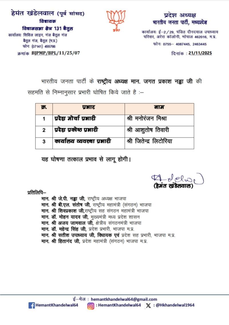 भोपाल l भारतीय जनता पार्टी के प्रदेश अध्यक्ष व विधायक श्री हेमंत खण्डेलवाल के द्वारा निम्नलिखित प्रभारियों की घोषणा की जाती है l
