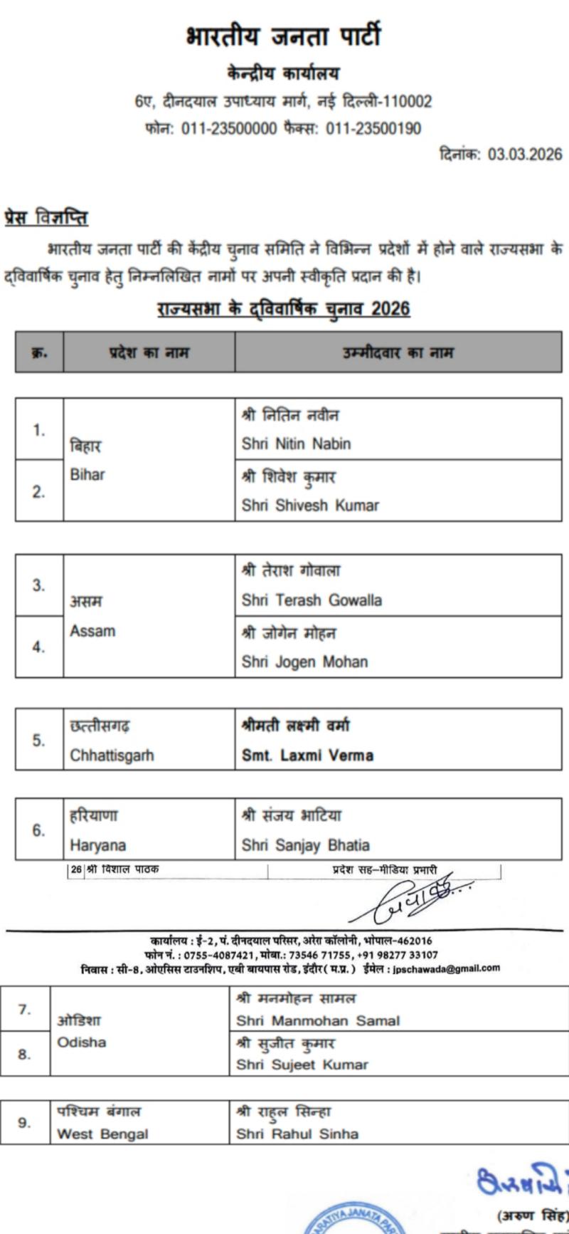 भाजपा ने अपने राज्य सभा उम्मीदवारों की सूची जारी की, देखिए पूरी सूची