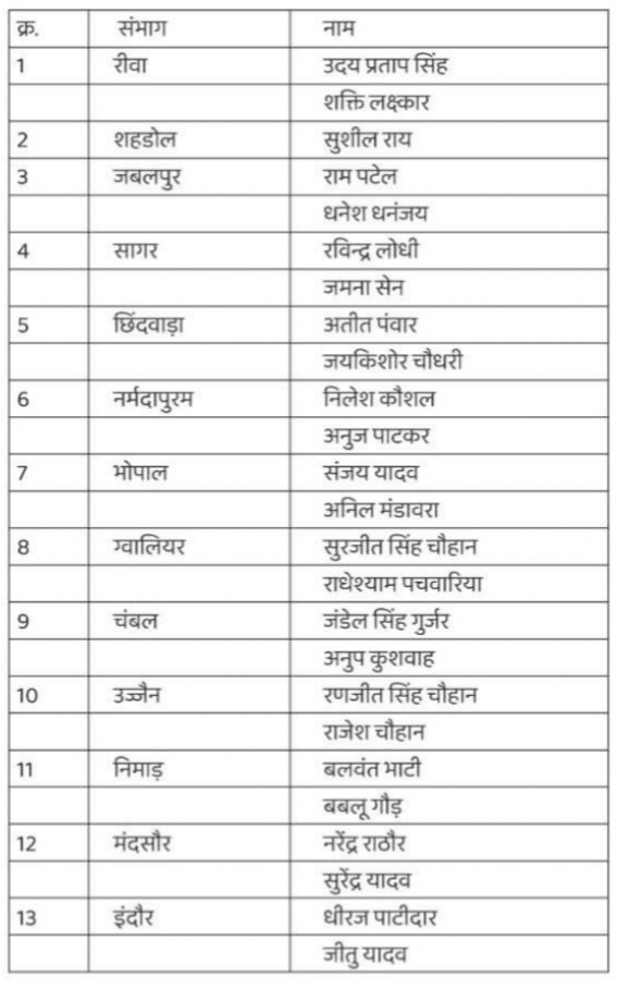 भोपाल l मध्यप्रदेश भारतीय जनता पार्टी के अध्यक्ष हेमंत खंडेलवाल की सहमति से भाजपा पिछड़ा वर्ग मोर्चा के संभाग प्रभारियों और सह प्रभारियों की घोषणा की गई है। देखिए पूरी सूची