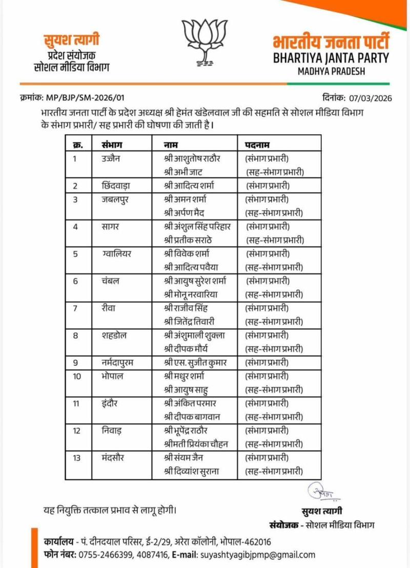 भोपाल l भारतीय जनता पार्टी के प्रदेश अध्यक्ष व विधायक श्री हेमंत खण्डेलवाल जी की सहमति से सोशल मीडिया के प्रदेश संयोजक श्री सुयश त्यागी ने सोशल मीडिया के संभाग प्रभारियों एवं सह प्रभारियों की घोषणा की है, जो उपरोक्तानानुसार है l