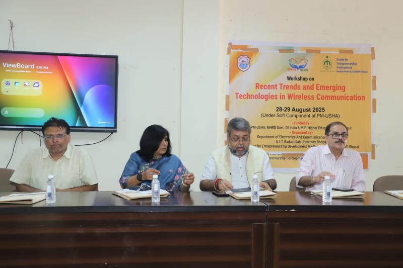 भोपाल l बरकतउल्लाह विश्वविद्यालय इंजीनियरिंग एवं प्रौद्योगिकी संस्थान (यूआईटी), इलेक्ट्रॉनिक्स एवं संचार अभियांत्रिकी विभाग के तत्वावधान में "Recent Trends and Emerging Technologies in Wireless Communication" विषय पर दो दिवसीय कार्यशाला (28-29 अगस्त 2025) का शुभारंभ हुआ। यह कार्यशाला पीएम-उषा योजना के अंतर्गत सैड मैप के सहयोग से आयोजित की जा रही है।कार्यक्रम संयोजक डॉ. पूनम सिन्हा, विभागाध्यक्ष ईसी विभाग ने बताया कि कार्यक्रम का उद्घाटन विश्वविद्यालय के कुलपति प्रो. एस.के. जैन (संरक्षक) के करकमलों द्वारा हुआ। इस अवसर पर प्रो. नीरज गौर, निदेशक यूआईटी (अध्यक्ष), डॉ. विपिन व्यास, पीएम-उषा नोडल अधिकारी, डॉ. रेखा खंडिया एवं डॉ. अरुण गुप्ता विशेष रूप से उपस्थित रहीं।
