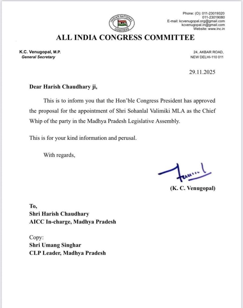 छिंदवाड़ा के परासिया से विधायक श्री सोहनलाल वाल्मीकि को कांग्रेस विधायक दल का मुख्य सचेतक (Chief Whip) बनाया गया है l