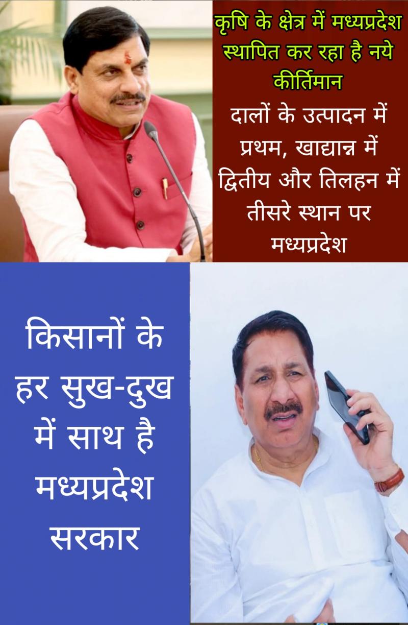 भोपाल l मुख्यमंत्री डॉ. मोहन यादव के नेतृत्व में कृषि विकास और किसान कल्याण में मध्यप्रदेश सरकार प्राण-प्रण से जुटी हुई है। मध्यप्रदेश उत्पादक गतिविधियों में नवाचार कर रहा है। सरकार किसानों के हर सुख-दुख में उनके साथ खड़ी है। प्रदेश ने कृषि क्षेत्र में नये कीर्तिमान स्थापित किये हैं। उत्पादन में रिकार्ड दर्ज कर प्रदेश को अनेक अवार्ड हासिल हुए हैं। म.प्र. दालों के उत्पादन में प्रथम स्थान पर, खाद्यान उत्पादन में द्वितीय स्थान पर और तिलहन उत्पादन में तृतीय स्थान पर है। प्रदेश में त्रि-फसली क्षेत्र में भी तेजी से वृद्धि हो रही है। प्रदेश में नरवाई जलाने की घटनाओं में कमी (हतोत्साहित) करने के लिए प्रदेश में प्रभावी कार्यवाही की गई है।