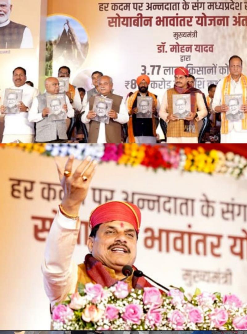 मुख्यमंत्री डॉ. यादव रविवार को रतलाम जिले के जावरा में सोयाबीन भावांतर भुगतान योजना के अंतर्गत किसानों को भावांतर राशि वितरण के लिए आयोजित राज्य स्तरीय सम्मेलन को संबोधित कर रहे थे। इस अवसर पर मुख्यमंत्री ने 3.77 लाख से अधिक सोयाबीन उत्पादक