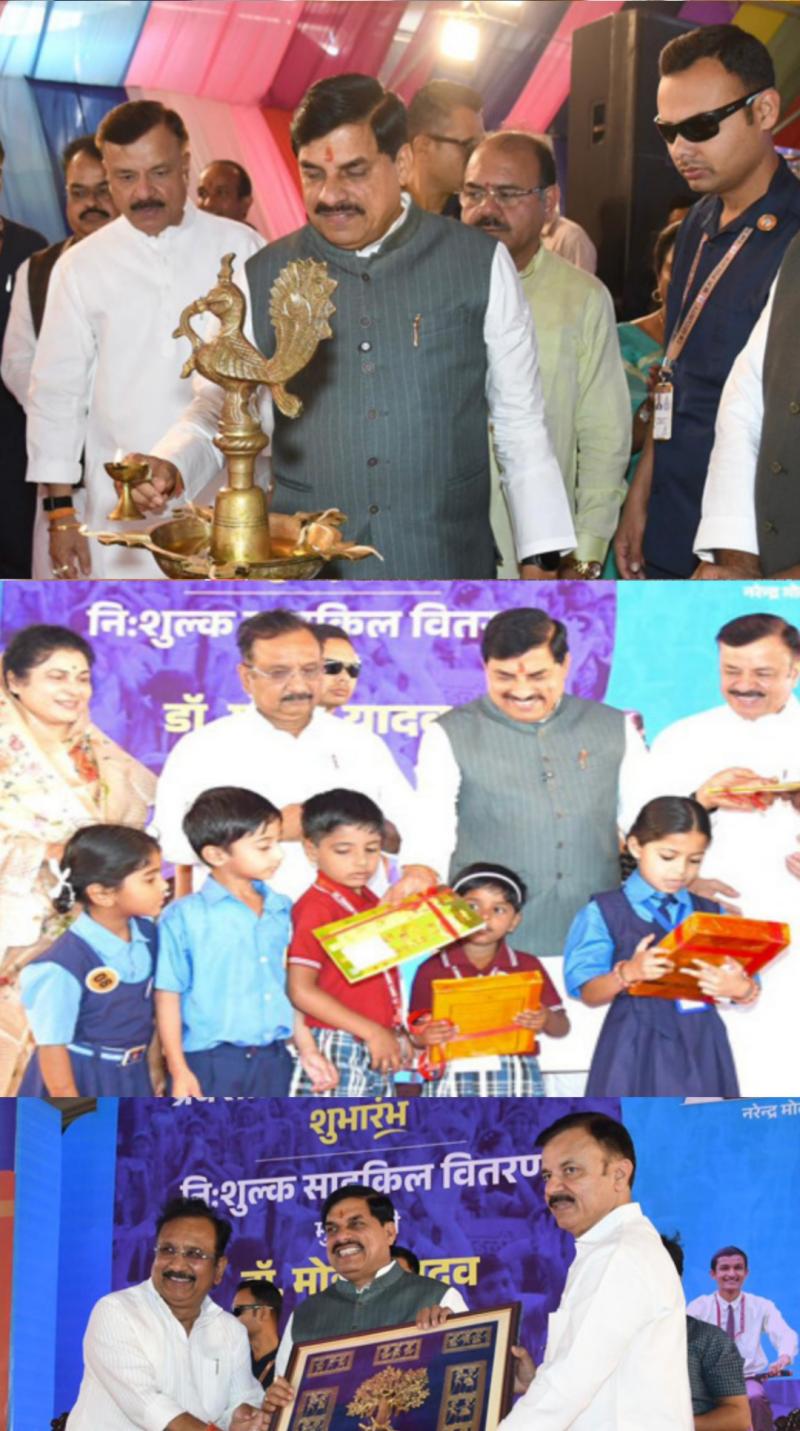वर्षा कर उनका स्वागत किया। मुख्यमंत्री डॉ. यादव ने अटल टिंकलिंग लैब, रोबोटिक लैब, व्यावसायिक शिक्षा और आईसीटी लैब के स्टॉल का अवलोकन किया। इस अवसर पर "स्कूल चले हम" अभियान पर केंद्रित एक लघु फिल्म का प्रदर्शन भी हुआ। मुख्यमंत्री डॉ. यादव के साथ नि:शुल्क साइकिल प्राप्त करने वाले स्कूली बच्चों का ग्रुप फोटो भी लिया गया। मुख्यमंत्री डॉ. यादव का अभिवादन किया।