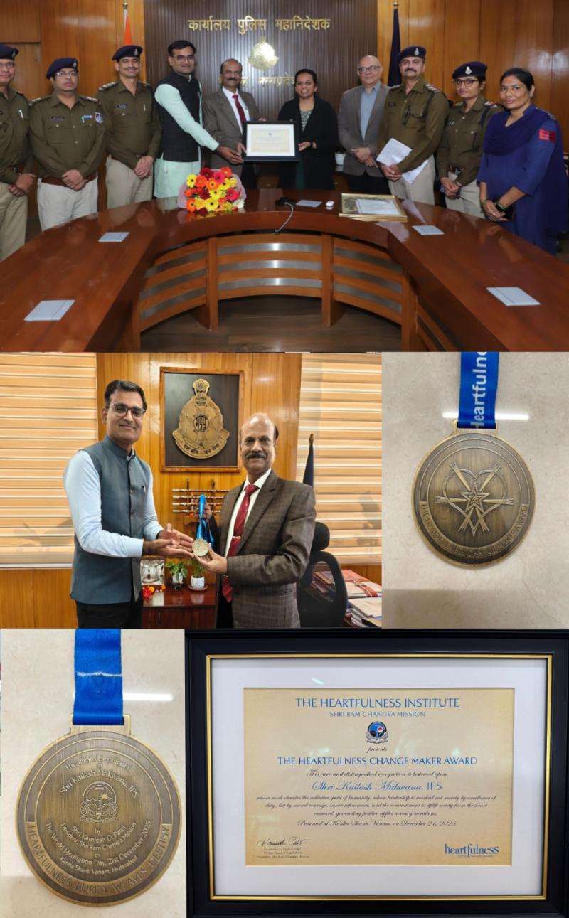 आज पुलिस मुख्यालय में हार्टफुलनेस संस्था के प्रतिनिधि एवं आईजी श्रीमती रूचिवर्धन ने डीजीपी श्री मकवाणा को यह सम्मान संस्था की ओर से प्रदान किया।