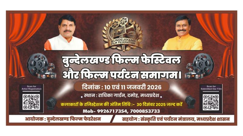 दमोह l विजनरी मुख्यमंत्री डॉ. मोहन यादव के कुशल नेतृत्व एवं संस्कृति, पर्यटन, धार्मिक न्यास एवं धर्मस्व राज्य मंत्री (स्वतंत्र प्रभार) श्री धर्मेन्द्र सिंह लोधी के सतत प्रयासों से मध्यप्रदेश आज फिल्म पर्यटन के क्षेत्र में निरंतर नए कीर्तिमान स्थापित कर रहा है। इसी दूरदर्शी सोच को साकार रूप देते हुए संस्कृति एवं पर्यटन विभाग मध्यप्रदेश तथा जिला प्रशासन दमोह के संयुक्त तत्वावधान में 7 से 11 जनवरी 2026 तक बुंदेलखंड फिल्म फेस्टिवल एवं फिल्म पर्यटन समागम का भव्य आयोजन किया जा रहा है।