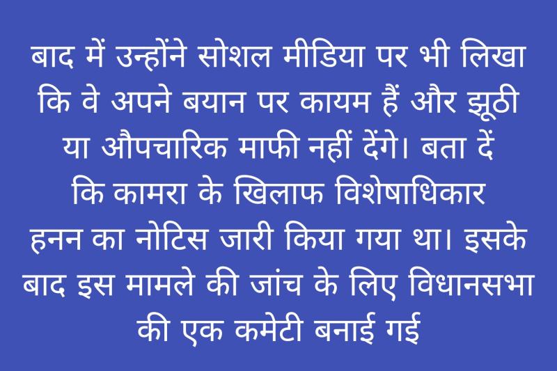मशहूर कॉमेडियन कुणाल कामरा महाराष्ट्र विधानसभा की एक कमेटी के सामने पेश हुए। यह मामला उनके द्वारा उपमुख्यमंत्री एकनाथ शिंदे पर की गई टिप्पणी से जुड़ा है। कमेटी के सामने पूछताछ के दौरान कामरा ने साफ कहा कि उन्हें अपने बयान पर कोई पछतावा नहीं है और वे माफी भी नहीं मांगेंगे।बाद में उन्होंने सोशल मीडिया पर भी लिखा कि वे अपने बयान पर कायम हैं और झूठी या औपचारिक माफी नहीं देंगे। बता दें कि कामरा के खिलाफ विशेषाधिकार हनन का नोटिस जारी किया गया था। इसके बाद इस मामले की जांच के लिए विधानसभा की एक कमेटी बनाई गई।