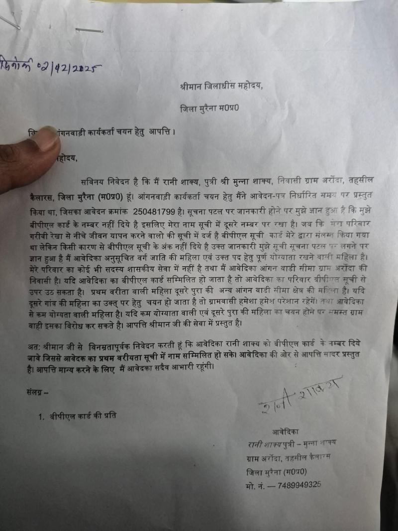 रोक कर लगाई कलेक्टर से न्याय की गुहार अरौदा निवासी मुन्नालाल शाक्य ने बताया कि मेरी बेटी की आंगनबाड़ी कार्यकर्ता भर्ती चयन प्रक्रिया में