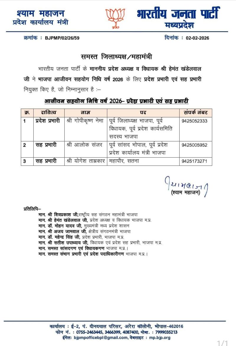 भोपाल l भारतीय जनता पार्टी के प्रदेश अध्यक्ष हेमंत खंडेलवाल ने पूर्व विधायक गोपी कृष्ण नेमा को बीजेपी आजीवन सहयोग निधि 2026 के लिए प्रदेश प्रभारी नियुक्त किया है साथ ही दो अन्य सह प्रभारी की भी घोषणा की है