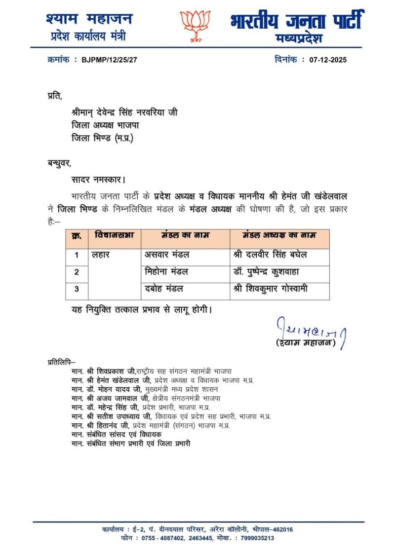 भोपाल l भाजपा प्रदेश अध्यक्ष हेमंत खंडेलवाल ने भाजपा भिण्ड जिले की लहार विधानसभा के निम्न मंडल अध्यक्षों के नामों की घोषणा की है l