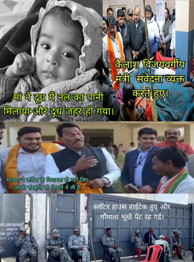 अभी नगर निगम इंदौर में ग़म के आंसू सूखे भी नहीं थे कि भोपाल नगर निगम अध्यक्ष हाथ मलती रह गईं । हिन्दूओं को ज़ख्म दे गईं ,जिसे धोने के लिए भोपाल तालाब का पानी भी कम पड़ जाएगा । छब्बीस टन मांस से भरे ट्रक में गौमाता के टुकड़े होने की पुष्टि लैब रिपोर्ट ने कर दी। इतिहास में लिखा जाएगा, बेटी के टुकड़े सूटकेस में और गौमाता के टुकड़े ट्रक में मिले। ग्वाले की सरकार कटघरे में खड़ी हो गई, नाक कट गई। हाईटेक स्लॉटर हाउस में बीफ से चीखें निकल रही है।कड़वा सच यह है कि स्लॉटर हाउस हाईटेक हुए और गौमाता भूखे पेट रह गई। गौशालाओं का भूसा धवल वस्त्रधारी बछड़ों ने खा लिया।
