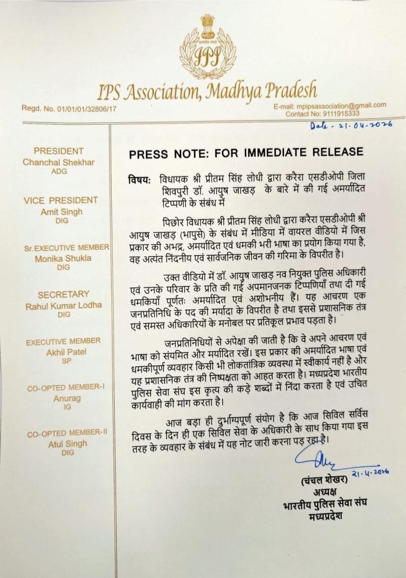 भोपाल l करेरा एसडीओपी आयुष जाखड़ के विरुद्ध भाजपा विधायक प्रीतम लोधी की धमकियों के खिलाफ IPS एसोसिएशन मैं मोर्चा खोल दिया है l