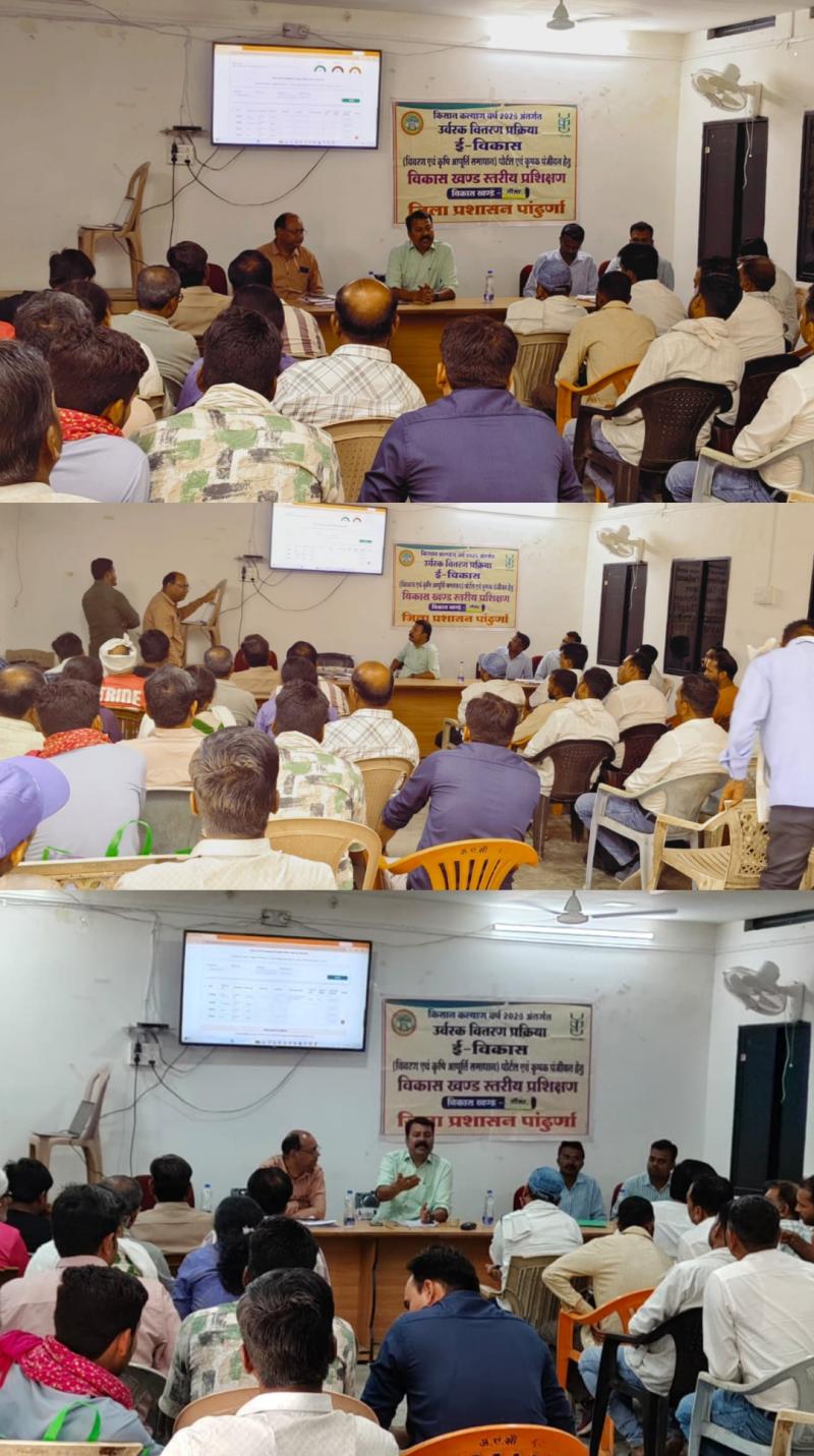 आज जिला-पाढुर्णा के समस्त सेवा सहकारी समितियों / मार्केटिंग समिति के प्रबंधकों, थोक उर्वरक विक्रेताओं का ई-विकास प्रणाली पोर्टल का प्रषिक्षण जनपद पंचायत कक्ष सौंसर में आयोजित किया गया हैं। शासन के निर्देषानुसार पूरे प्रदेष में 01 अप्रैल 2026 से शतप्रतिषत उर्वरकों का वितरण ई-विकास प्रणाली के माध्यम से किया जाना हैं, जिसके परिपालन में लगातार विक्रेताओं के प्रषिक्षण आयोजित किये जा रहे है। शासन द्वारा संषोधित किये गये ई-विकास पोर्टल का जिले की समस्त सेवा सहकारी समिति के प्रबंधकों एवं निजी उर्वरक विक्रेताओ को प्रषिक्षण प्रदान किया गया हैं।