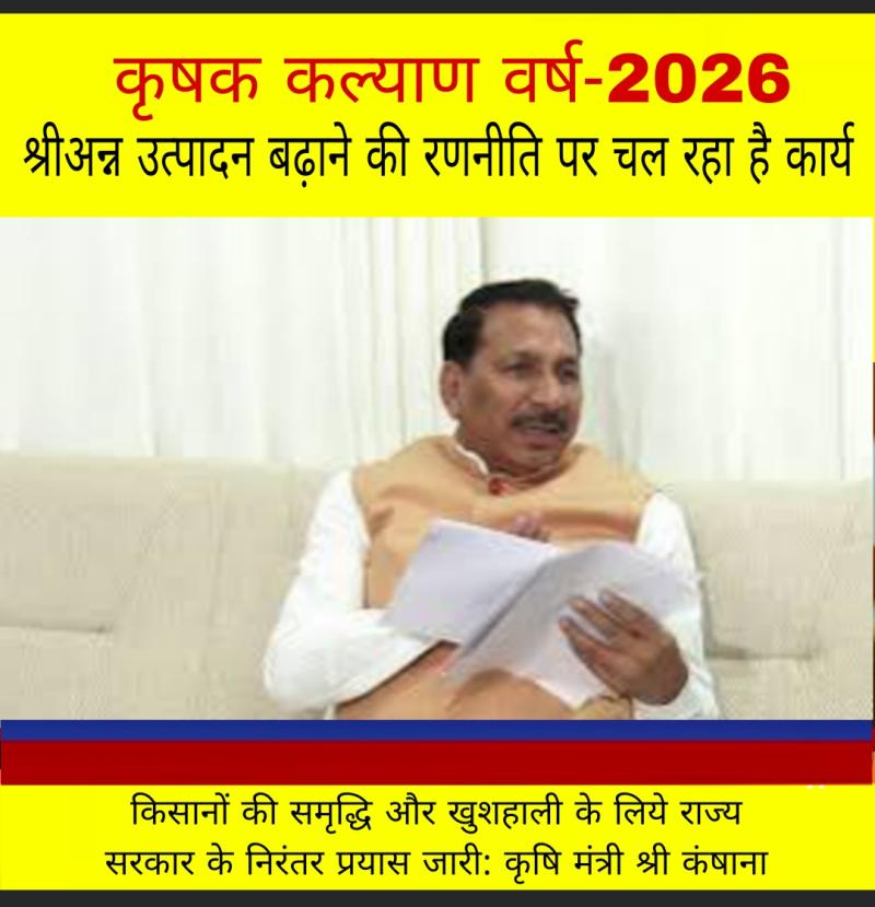 कृषि मंत्री श्री कंषाना ने कहा कि कृषक कल्याण वर्ष 2026 में राज्य सरकार श्रीअन्न उत्पादन बढ़ाने की रणनीति पर कार्य कर रही है। मुख्यमंत्री डॉ. यादव जनजातीय बहुल्य क्षेत्रों में पारंपरिक कोदो-कुटकी का संवर्धन और उत्पादन बढ़ाने के लिये किसानों को प्रोत्साहित कर रहे हैं। मध्यप्रदेश की तीन फसलों सिताही, कुटकी, नागदमन कुटकी और बैंगनी अरहर को जीआई टैग दिलाने के लिये प्रस्ताव चैन्नई भेजे गए हैं। रानी दुर्गावती श्रीअन्न प्रोत्साहन योजना का लाभ किसानों को मिल रहा है।