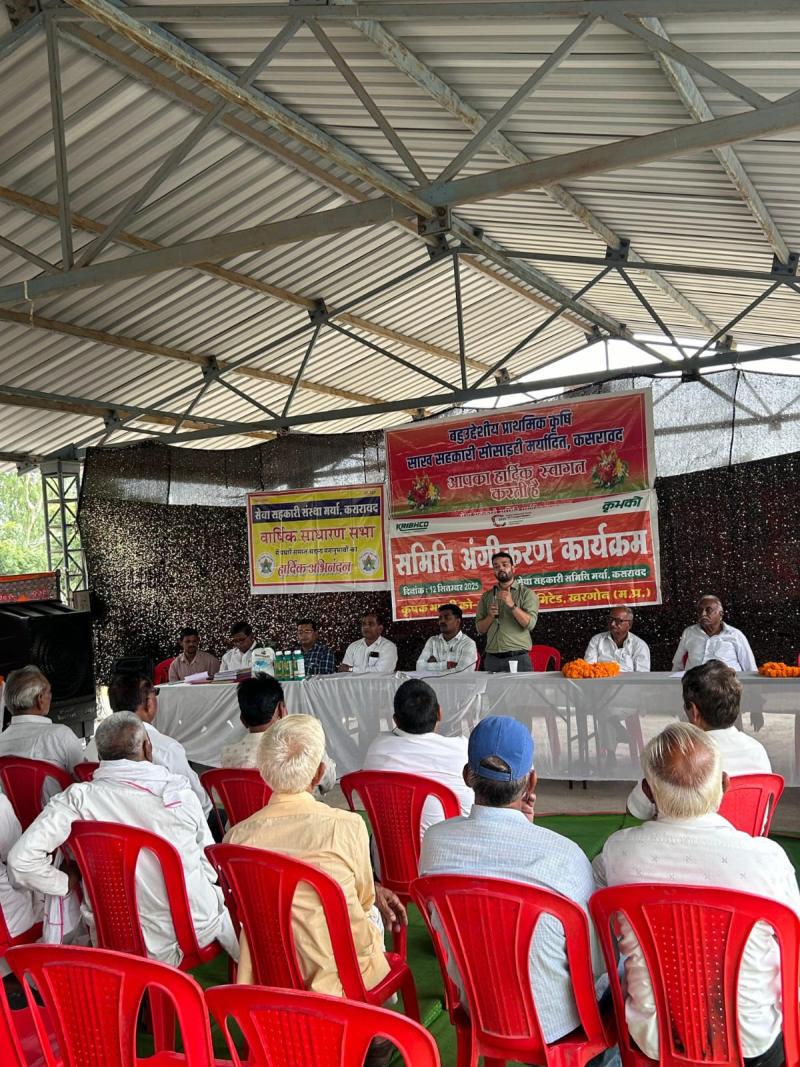 खरगोन l समिति अंगीकरण कार्यक्रम का आयोजन आज कृषक भारती कोआपरेटिव लिमिटेड खरगोन द्वारा सेवा सहकारी समिति कसरावद जिला खरगोन में किया गया| जिसके मुख्य अतिथि श्रीमान आर.आर भट ( सहकारिता निरीक्षक कसरावद ), विशेष अतिथि श्री राज बाबू कुमार (क्षेत्रीय प्रबंधक कृभको इंदौर ), एवं श्री मांगीलाल पाटीदार पूर्व समिति अध्यक्ष , कृभको आम सभा सदस्य श्री रामकृष्ण पाटीदार , के अलाव 100 से अधिक प्रगतिशील किसान कार्यक्रम में उपस्थित रहे|