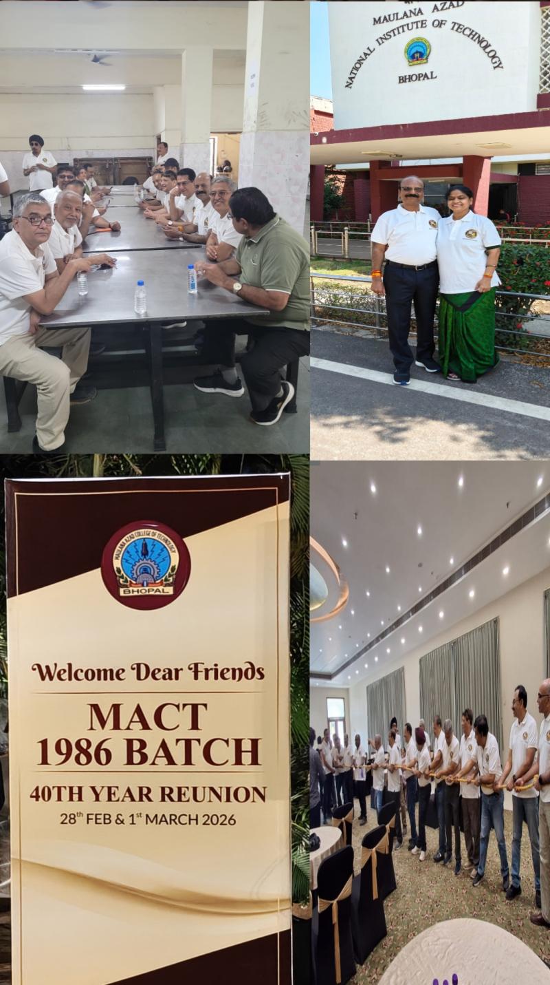 भोपाल । मौलाना आज़ाद राष्ट्रीय प्रौद्योगिकी संस्थान (MANIT), भोपाल के वर्ष 1986 बैच के पूर्व छात्र-छात्राओं का 40 वर्ष बाद आयोजित भव्य पुनर्मिलन (Reunion) कार्यक्रम 28 फरवरी एवं 01 मार्च 2026 तक भोपाल में गरिमामय एवं उत्साहपूर्ण वातावरण में सम्पन्न हुआ। चार दशक बाद हुए इस मिलन समारोह ने न केवल पुराने साथियों को पुनः एक मंच पर लाया, बल्कि छात्र जीवन की स्मृतियों, संघर्षों और उपलब्धियों को भी फिर से जीवंत कर दिया।