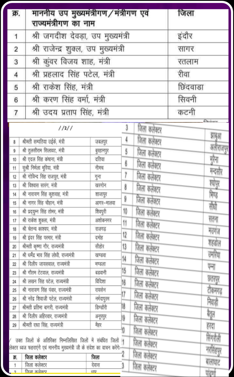 भोपाल। राज्यपाल महामहिम मंगू भाई पटेल भोपाल में तथा मुख्यमंत्री डॉ मोहन यादव उज्जैन में राष्ट्रीय पर्व गणतंत्र दिवस के अवसर पर ध्वजारोहण करेंगे l कौन मंत्री किस जिले में ध्वजारोहण करेंगे देखिए पूरी लिस्ट ...