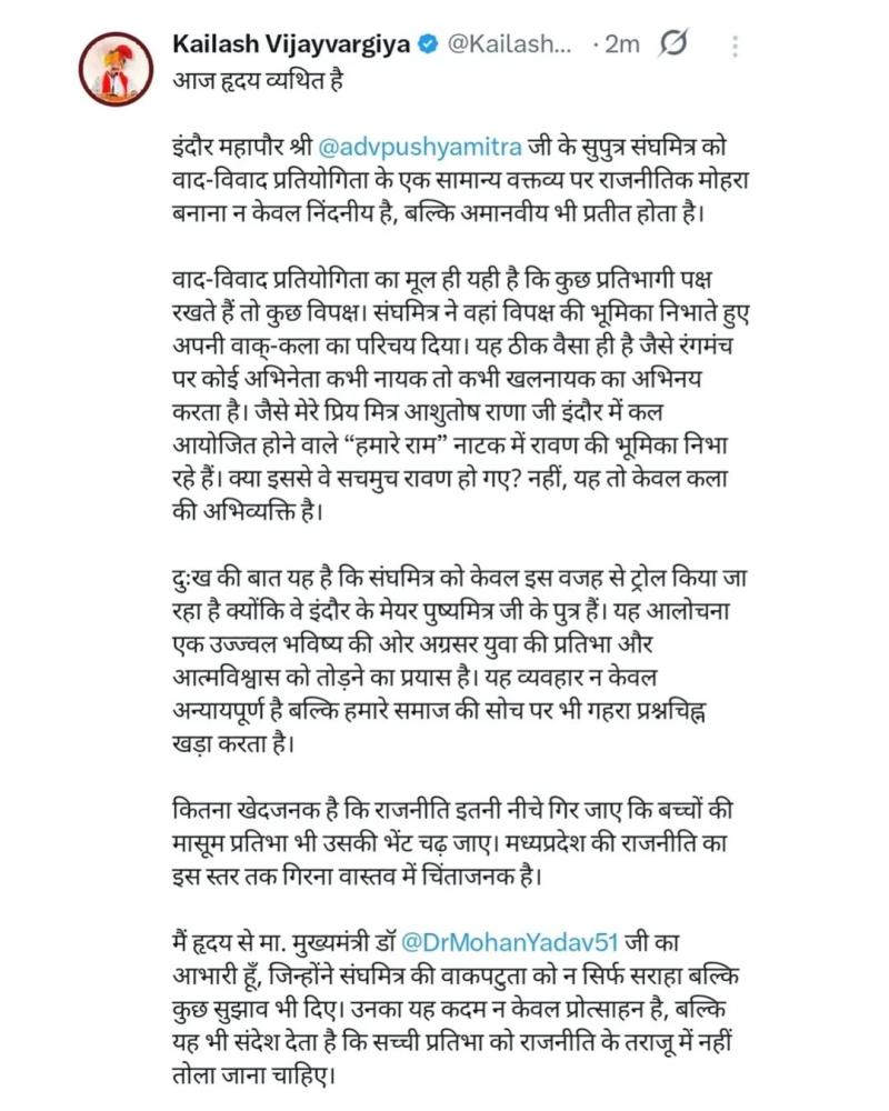 मध्य प्रदेश के नगरीय प्रशासन मंत्री कैलाश विजयवर्गीय की फेसबुक वाल से साभार