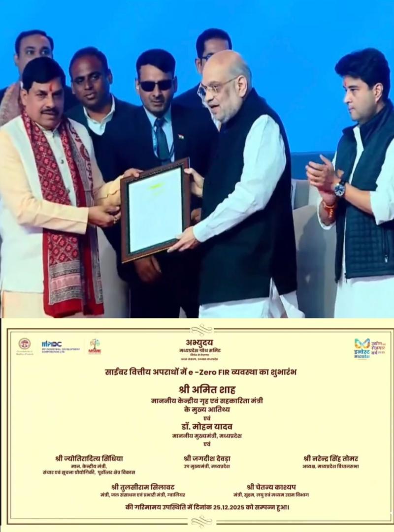 केंद्रीय गृह मंत्री श्री अमित शाह के नेतृत्व में देश में साइबर अपराध से निपटने हेतु ऐतिहासिक और तकनीक-आधारित कदम उठाए जा रहे हैं। इसी क्रम में पूर्व प्रधानमंत्री श्रद्धेय श्री अटल बिहारी वाजपेयी जी के जन्म दिवस को ‘सुशासन दिवस’ के रूप में मनाए जाने की परंपरा के अनुरूप, मध्यप्रदेश पुलिस द्वारा प्रशासनिक सुशासन को सुदृढ़ करने हेतु एक नवीन अभिनव पहल के रूप में ई-जीरो एफआईआर (e-Zero FIR) व्यवस्था का शुभारंभ किया गया। जिसका उद्घाटन ग्वालियर में आयोजित अभ्युदय मध्यप्रदेश ग्रोथ समिट के दौरान माननीय केंद्रीय गृह एवं सहकारिता मंत्री श्री अमित शाह द्वारा किया गया। इस अवसर पर ई-जीरो एफआईआर की पहली प्रति माननीय मुख्यमंत्री डॉ. मोहन यादव को सौंपी गई। इसके साथ ही मध्यप्रदेश, दिल्ली के बाद देश का दूसरा राज्य बन गया है, जहाँ ई-जीरो एफआईआर प्रणाली को लागू किया गया है। यह पहल पुलिस को अपराधियों से एक कदम आगे रखने की दिशा में मील का पत्थर साबित होगी।
