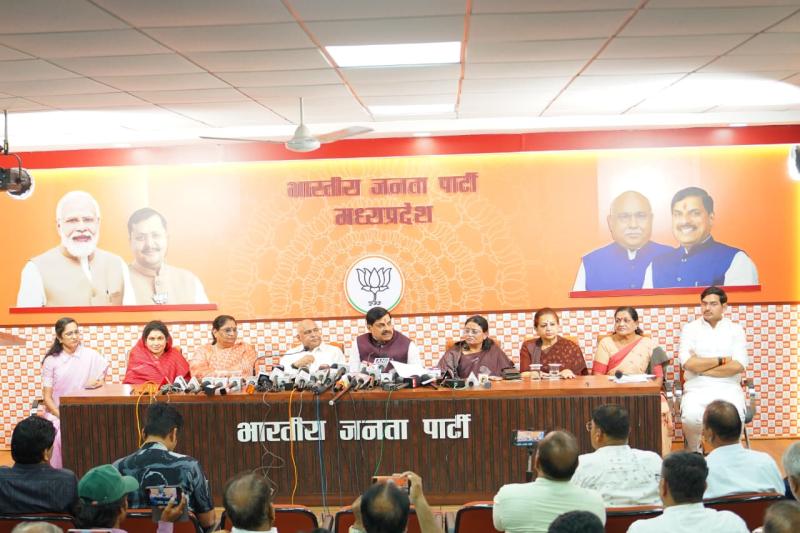 पत्रकार-वार्ता के दौरान मध्यप्रदेश शासन की कैबिनेट मंत्री श्रीमती निर्मला भूरिया, प्रदेश शासन की राज्य मंत्री (स्वतंत्र प्रभार) श्रीमती कृष्णा गौर, पार्टी की प्रदेश प्रवक्ता, पूर्व मंत्री व विधायक श्रीमती अर्चना चिटनीस, सांसद श्रीमती माया नारोलिया, महिला मोर्चा की प्रदेश अध्यक्ष श्रीमती अश्विनी परांजपे एवं प्रदेश मीडिया प्रभारी श्री आशीष उषा अग्रवाल मंचासीन रहे।