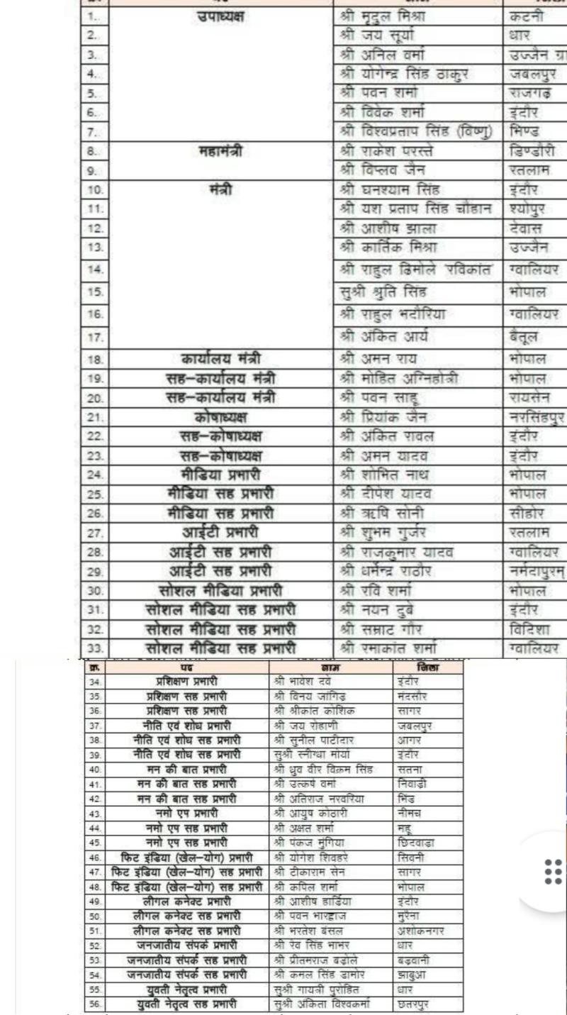 MP - युवा मोर्चा के प्रदेश पदाधिकारियों के नामों की घोषणा, देखिए पूरी सूची