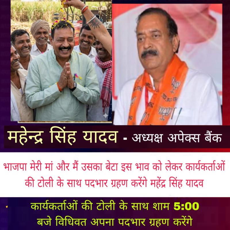 भाजपा मेरी मां और मैं उसका बेटा इस भाव को लेकर कार्यकर्ताओं की टोली के साथ पदभार ग्रहण करेंगे महेंद्र सिंह यादव...